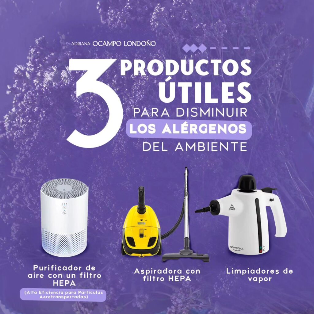 Aquí te dejo tres productos que pueden ser útiles para disminuir los alérgenos del ambiente, principalmente en alergias respiratorias.